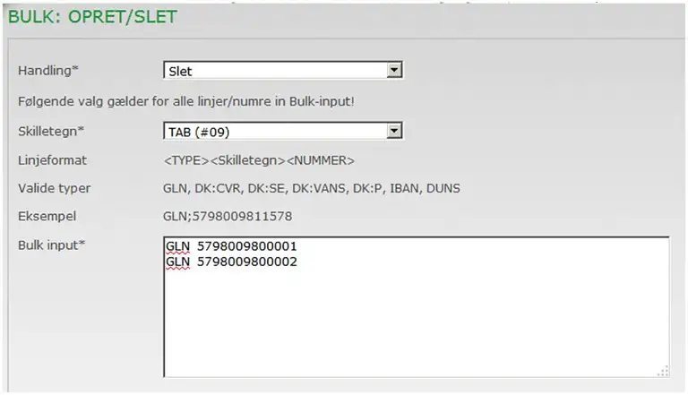 Nederst i menuen på forsiden findes punktet ”Bulk: Opret/slet”. Tanken er, at man nemt skal kunne oprette/vedligeholde eller slette et større antal registreringer i NHR på én gang.