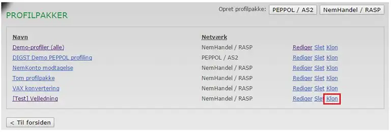 Klik på ’Klon’ ud fra den profilpakke, du ønsker at klone.