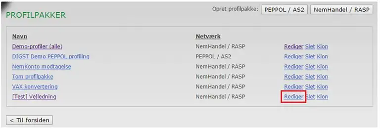 Vælg hvilken profilpakke du ønsker at redigere, slette eller klone.
