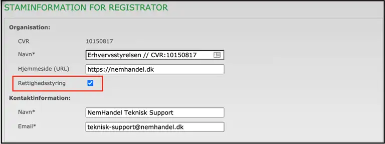 Login i NHR Web (som normalt) og gå til ”Rediger staminformation for registrator”. Under vedligehold af staminformation, skal der sættes kryds i Rettighedsstyring: